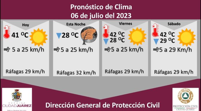 La Dirección General de Protección Civil, con base en informes del Servicio Meteorológico Nacional, pronostica una temperatura máxima de 41 grados Celsius para este jueves, mientras que la mínima será de 28 °C por la noche.