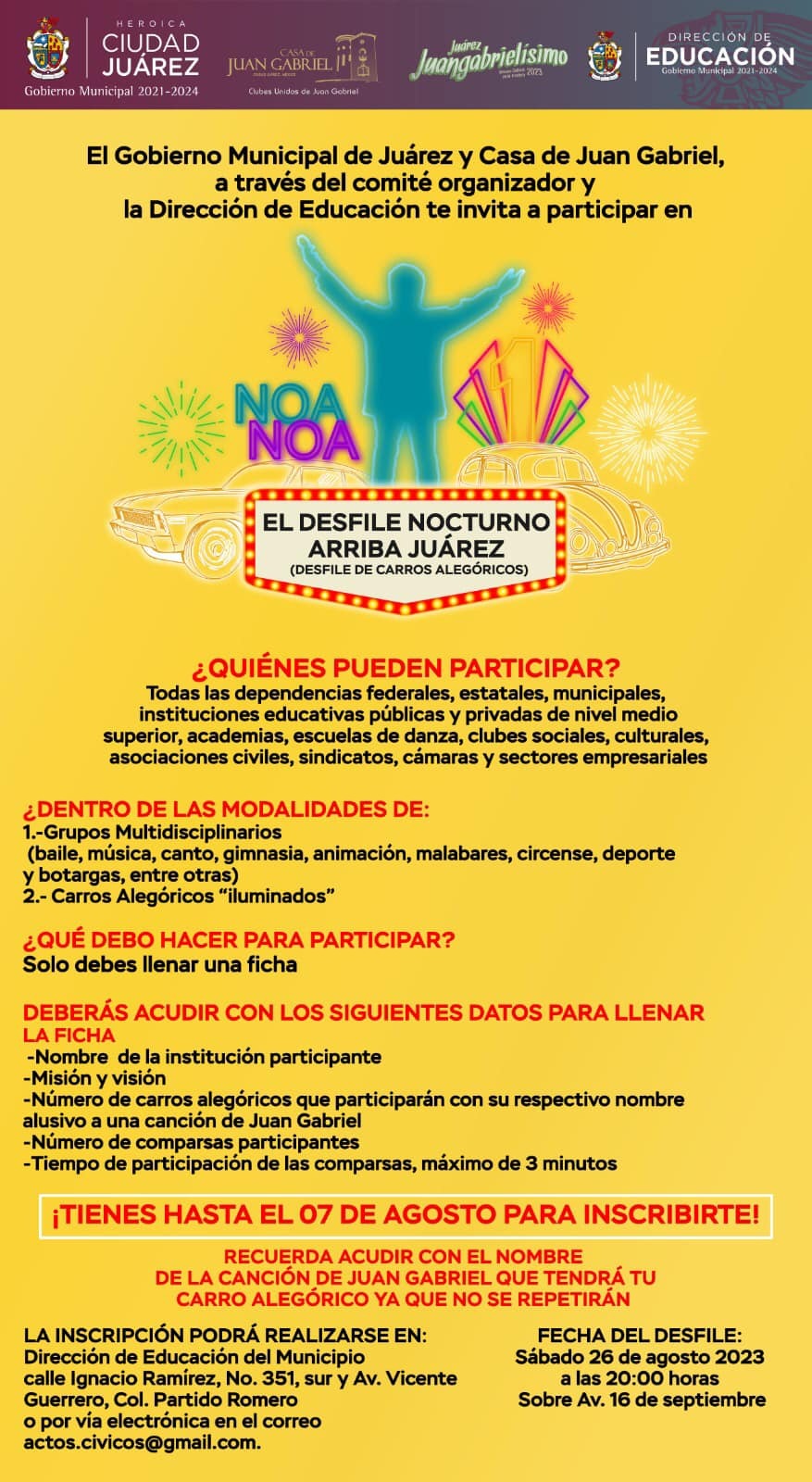 Debido a que el próximo lunes concluye la convocatoria para participar en el desfile en homenaje al “Divo de Juárez” Juan Gabriel, la Dirección de Educación invita a las asociaciones y clubes a registrarse y ser parte del espectáculo nocturno.