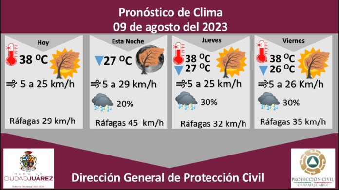 Para mañana jueves se espera un día parcialmente nublado con fuertes ráfagas de viento que alcanzarán los 32 kilómetros por hora, además existe un 30 por ciento de probabilidad de lluvia, la temperatura máxima se pronostica en los 38 °C, mientras que la mínima será de 27 °C, la velocidad del viento oscilará de 5 a 25 kilómetros por hora.