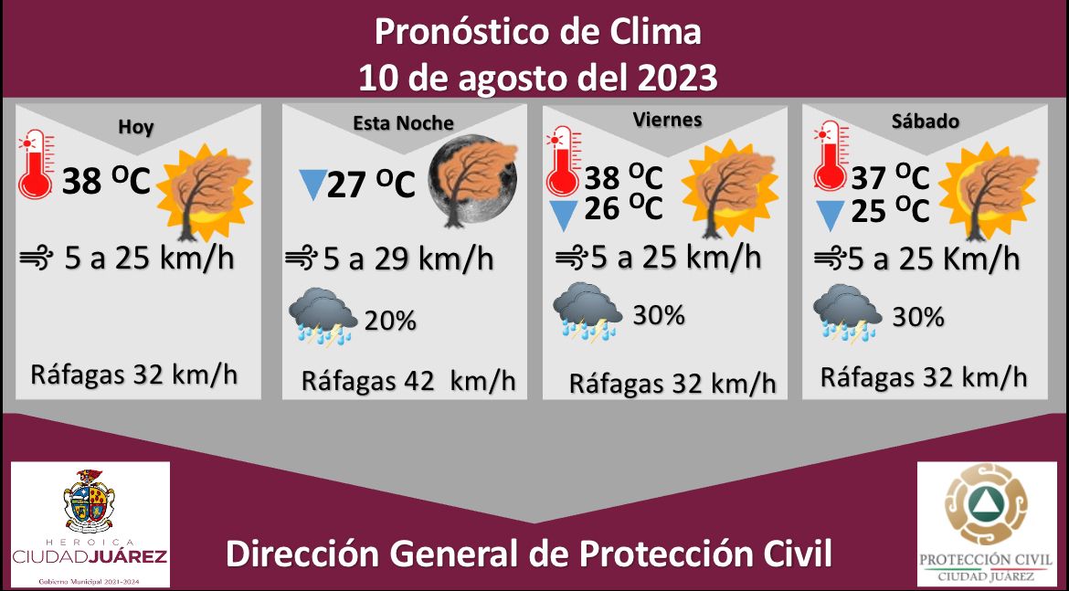 Roberto Briones Mota, titular de la dependencia, informó que para hoy se esperan fuertes ráfagas de viento de hasta 42 kilómetros por hora, con una temperatura máxima de 38 °C y mínima de 27 °C, la velocidad del viento se pronostica entre 5 y 29 kilómetros por hora.