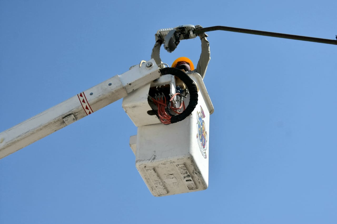 Personal de la Dirección de Alumbrado Público continúa trabajando en el fraccionamiento Las Almeras en la instalación de luminarias nuevas de tecnología led.