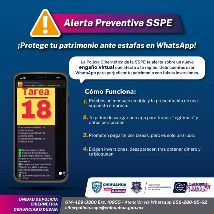 La Unidad de Policía Cibernética de la Secretaría de Seguridad Pública del Estado (SSPE), emitió una alerta en relación a un nuevo modus operandi de estafa virtual que se ha detectado en la región a través de WhatsApp para atraer a víctimas con oportunidades falsas de inversión