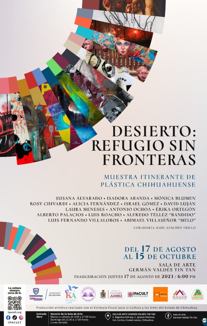La exposición lleva por nombre “Desierto: refugio sin fronteras”; reúne los trabajos de un colectivo integrado por 15 artistas del estado, de los cuales 13 son de Ciudad Juárez, 1 de ciudad Delicias y otro más de ciudad Cuauhtémoc.