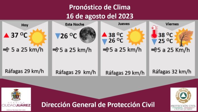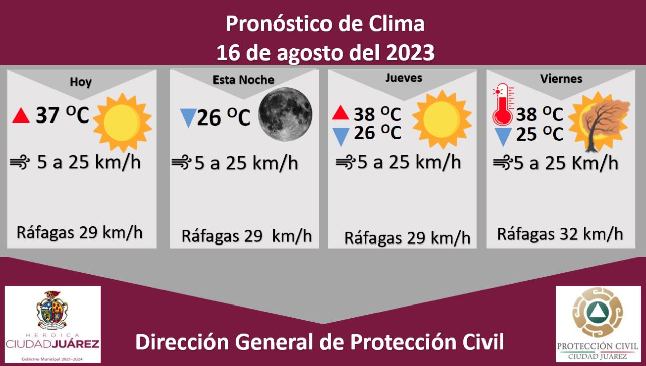 La Dirección General de Protección Civil, con base en informes del Servicio Meteorológico Nacional, pronostica una temperatura máxima de 36 °C para este miércoles, mientras que la mínima para esta noche será de 25 °C, además se esperan ráfagas de viento de hasta 29 kilómetros por hora.
