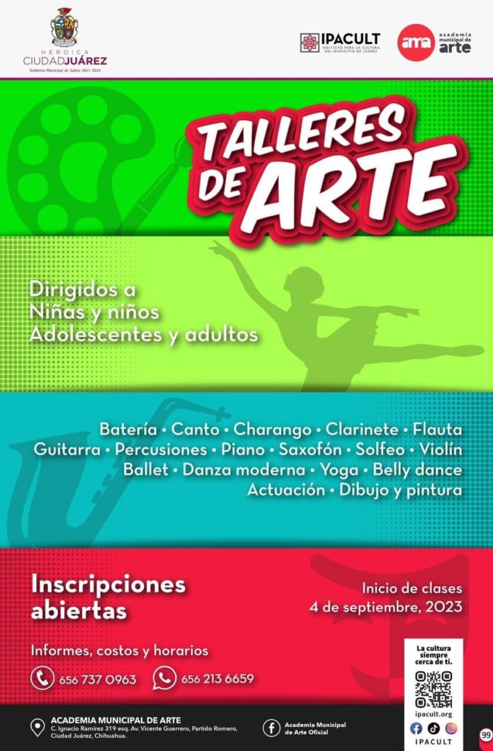 El Instituto para la Cultura del Municipio de Juárez (IPACULT) a través de la Academia Municipal de Arte (AMA), invita a niños y niñas mayores de cuatro años, jóvenes y adultos que deseen sumarse al aprendizaje de las artes, participando en los diferentes talleres que ofrece la academia para el ciclo septiembre-diciembre.