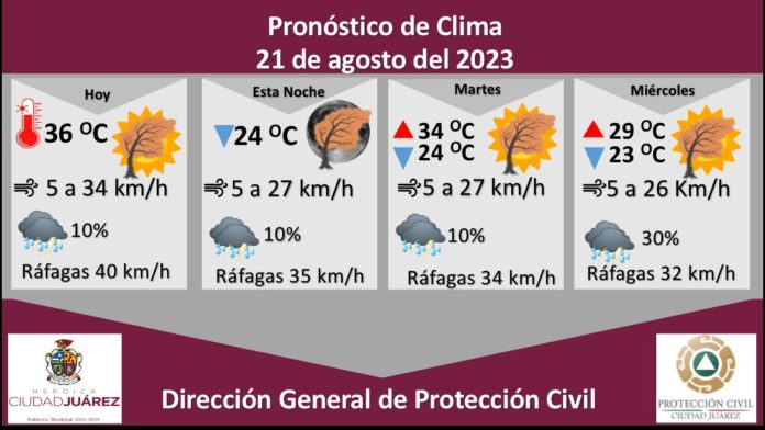 Mencionó que para hoy se espera una temperatura máxima de 36 °C y mínima de 24 °C, la velocidad del viento se pronostica entre 5 y 40 kilómetros por hora.