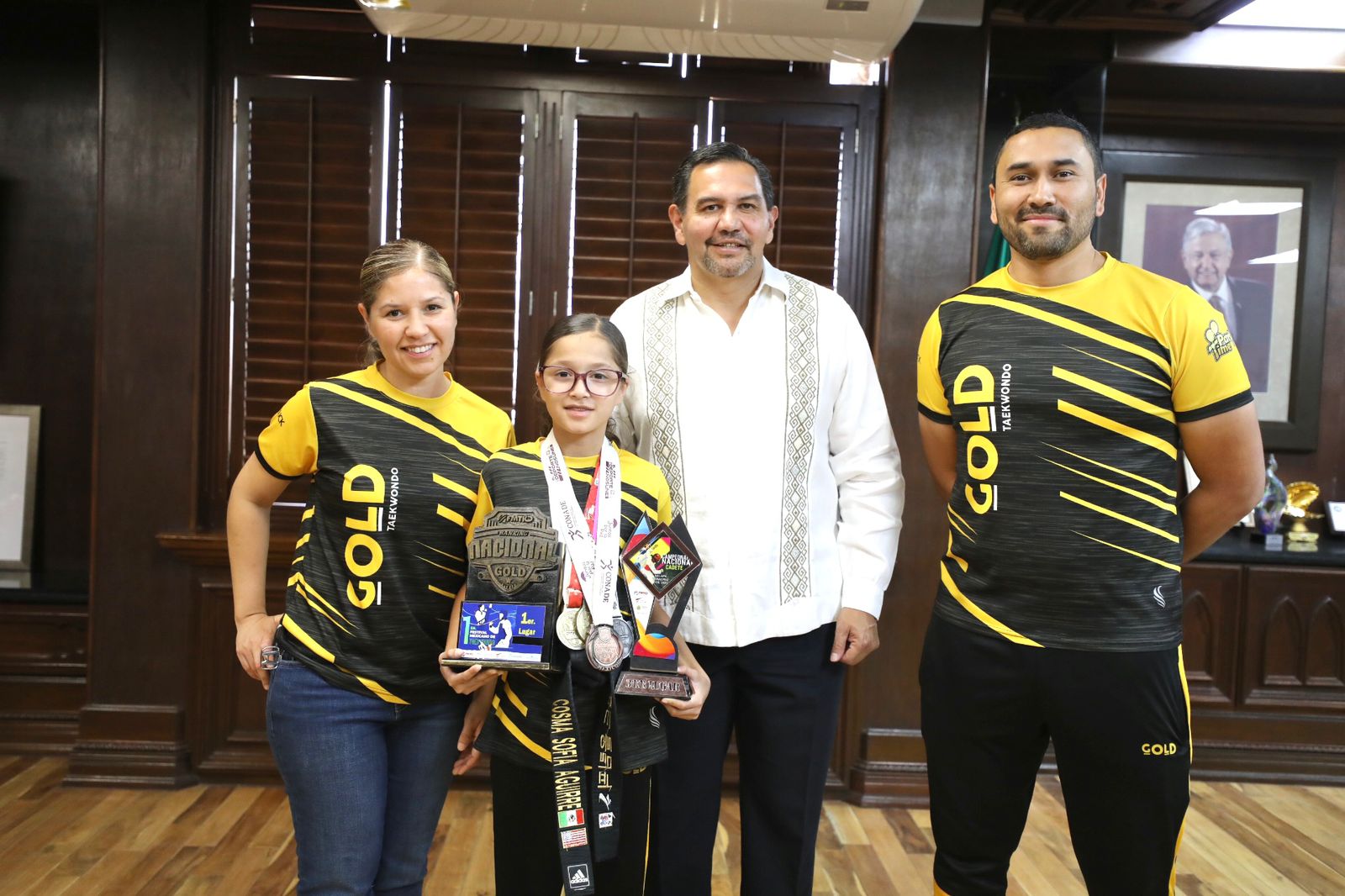 La tres veces campeona nacional en Taekwondo, Cosma Sofía Aguirre Chávez, visitó hoy al Presidente Municipal, Cruz Pérez Cuéllar, quien la felicitó por sus enormes logros en esta rama de las artes marciales a su corta edad, 12 años.