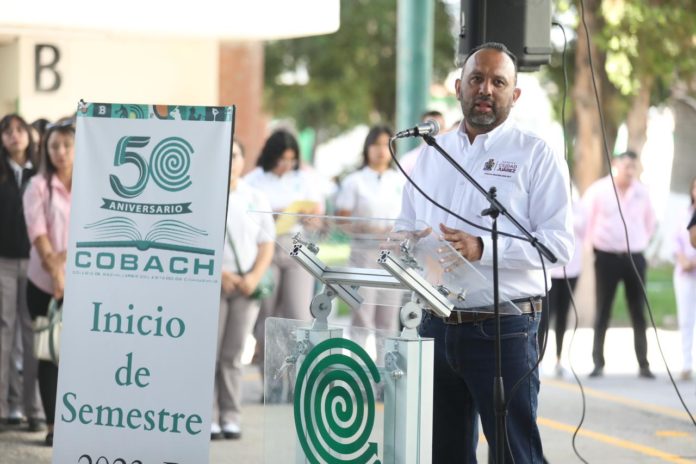 El secretario del Ayuntamiento, Héctor Rafael Ortiz Orpinel, acudió en representación del Presidente Municipal, Cruz Pérez Cuéllar, a la ceremonia del inicio del ciclo escolar 2023-2024 de los Colegios de Bachilleres del Estado de Chihuahua (COBACH), la cual se llevó a cabo en el plantel número 5.