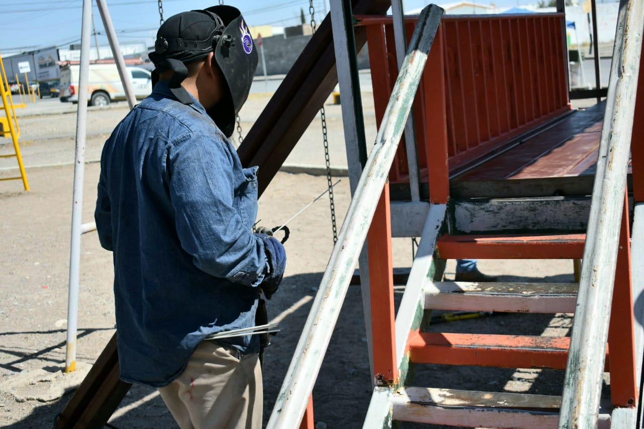 Empleados de la Dirección de Parques y Jardines trabajaron en darle mantenimiento a tres parques ubicados en el fraccionamiento Oasis Revolución, en la zona surponiente de la ciudad.