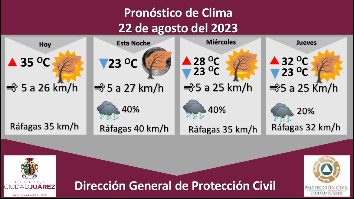 Mencionó que para hoy se espera una temperatura máxima de 35 °C y mínima de 23 °C, la velocidad del viento se pronostica entre 5 y 27 kilómetros por hora.