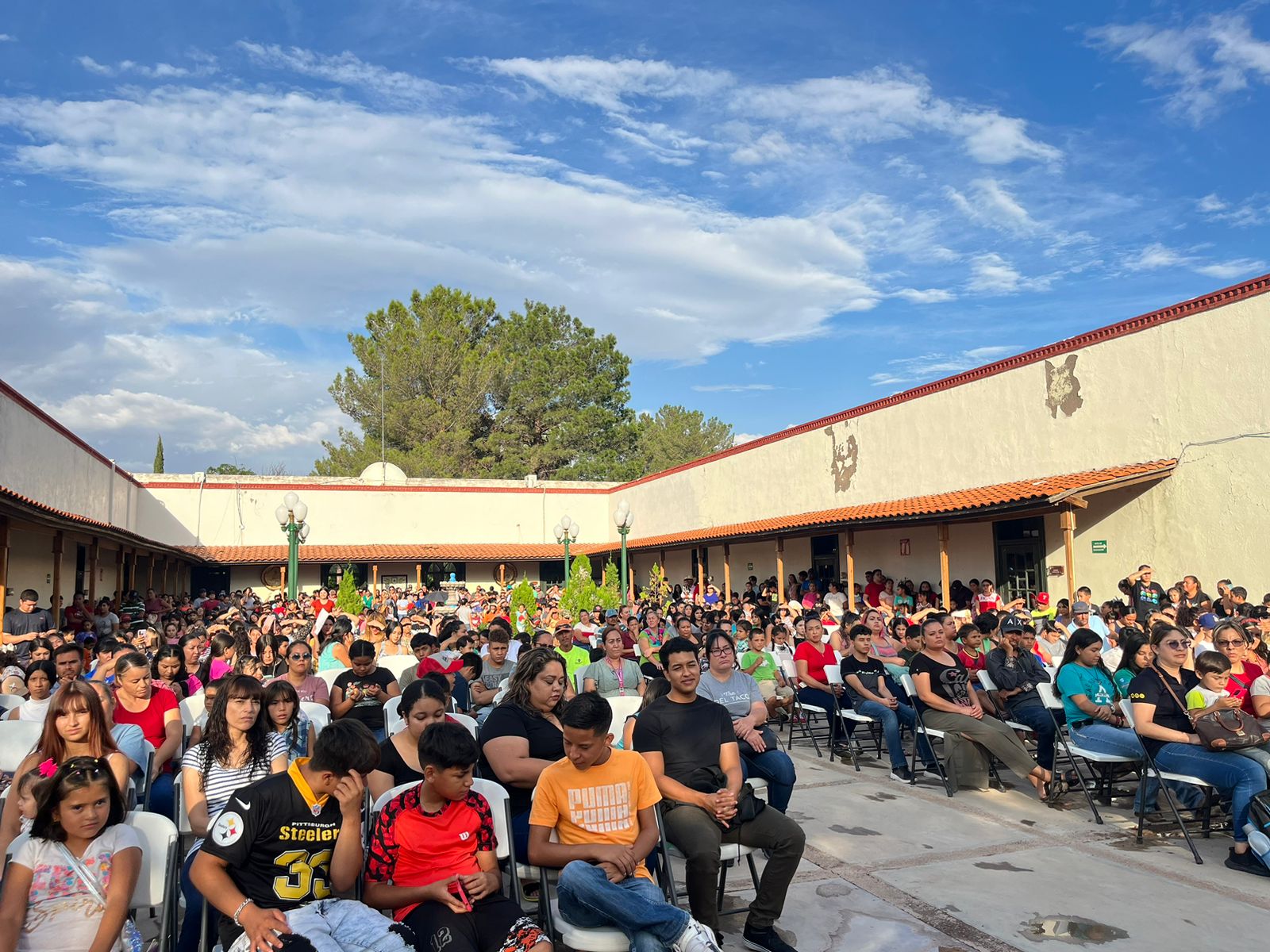 El evento comenzó a las 6:00 PM en el patio de Presidencia Municipal. En el presídium estuvieron la Regidora de Desarrollo Social, Lizbeth Jacquez, el Regidor de Educación, Juan Oleg Flores, la Presidenta del DIF, Lic. Carolina Meza, el Sindico Municipal, Ing. Raymundo Bejarano, el Secretario del Ayuntamiento, Ing. José Casas, el Director de Desarrollo Social, Lic. Juan López, Director de Educación, Ing. Alberto Chávez y el Alcalde C. Roberto Lucero Galaz.
