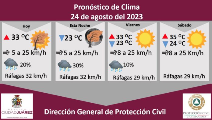 Para mañana viernes se pronostican fuertes ráfagas de viento que alcanzarán los 29 kilómetros por hora, existe una probabilidad de lluvia de un 10 por ciento, la temperatura máxima será de 33 °C y mínima de 23 °C, la velocidad del viento oscilará entre 8 y 25 kilómetros por hora.