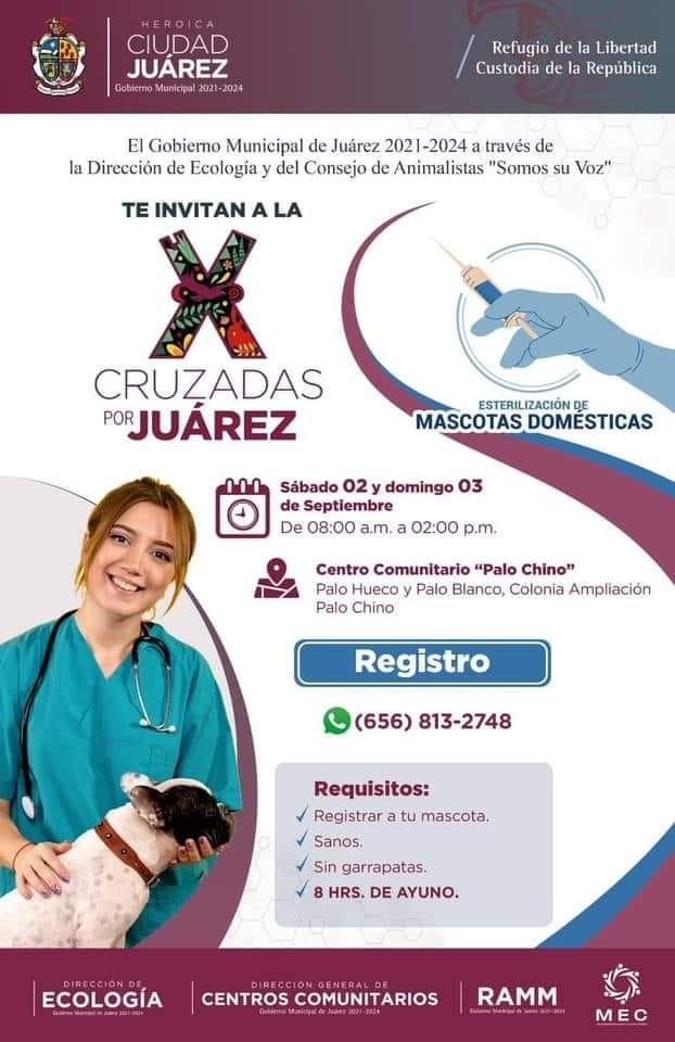 La Dirección General de Centros Comunitarios invita a la población a participar en la Cruzadas por Juárez, a través del cual ofrecerán esterilización gratuita de mascotas domésticas.