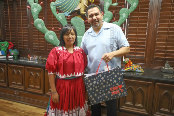 La maratonista rarámuri, Verónica Palma Cruz, visitó al Presidente Municipal, Cruz Pérez Cuéllar, para compartirle su experiencia en los Juegos Mundiales Máster de Pueblos Indígenas que se desarrollaron en Canadá, en los que ganó triple medalla de oro.