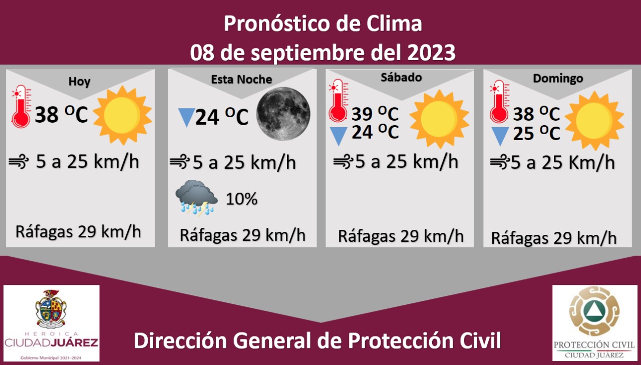 Para mañana sábado se espera un día soleado, con fuertes ráfagas de viento que llegarán a los 29 kilómetros por hora, la temperatura máxima será de 39 °C y mínima de 24 °C, la velocidad del viento oscilará entre 5 y 25 kilómetros por hora.