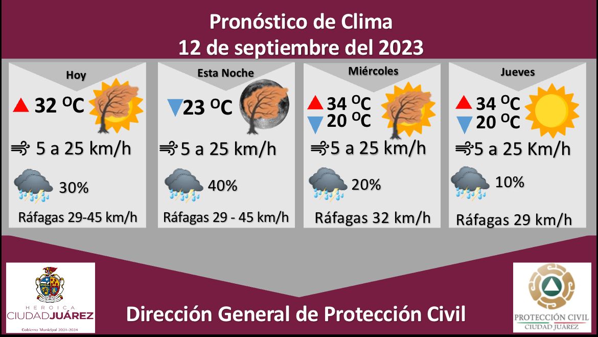 Para mañana miércoles se esperan fuertes ráfagas de viento que alcanzarán los 32 kilómetros por hora, existe una probabilidad de lluvia de un 20 por ciento, la temperatura máxima será de 34 °C, mientras que la mínima será de 20 °C, la velocidad del viento oscilará de 5 a 25 kilómetros por hora.