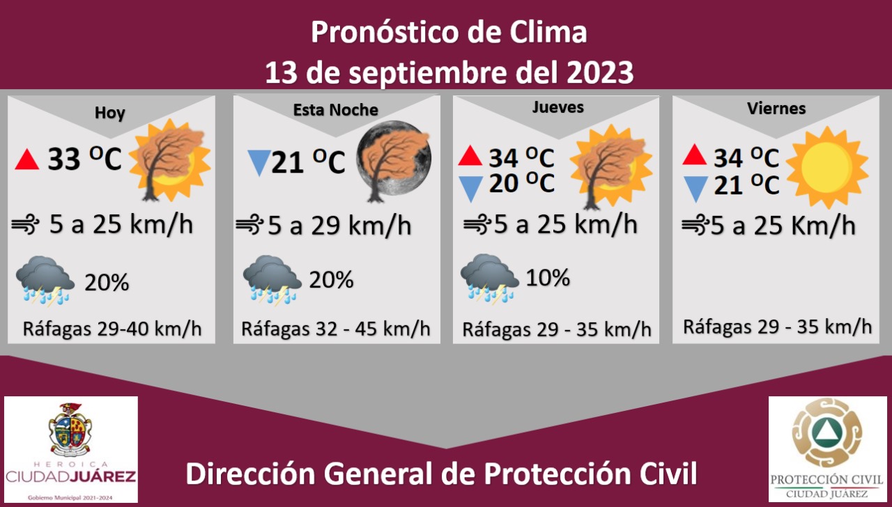 Para mañana jueves se esperan fuertes ráfagas de viento que alcanzarán los 35 kilómetros por hora, existe una probabilidad de lluvia de un 10 por ciento, la temperatura máxima será de 34 °C, mientras que la mínima será de 20 °C, la velocidad del viento oscilará de 5 a 25 kilómetros por hora.