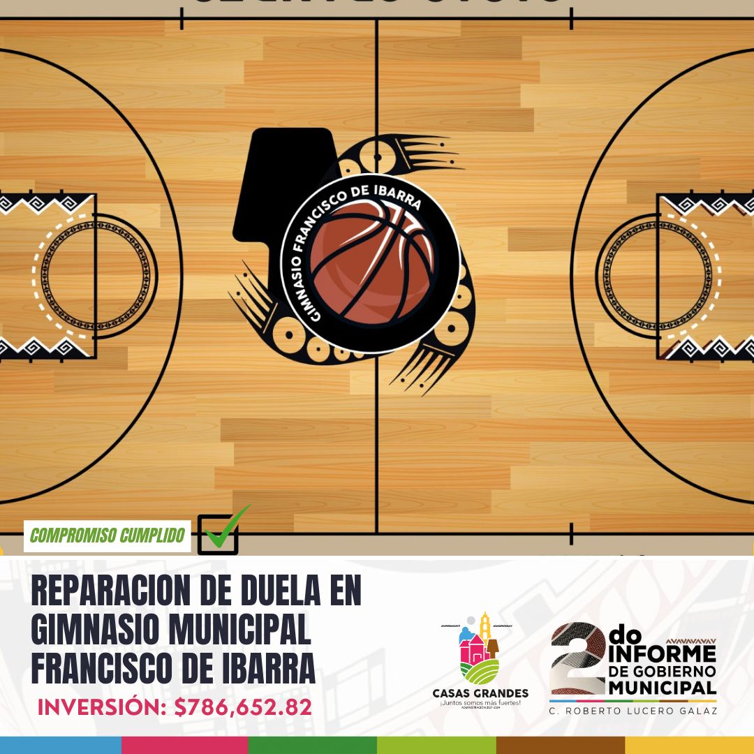 El día de ayer Municipio de Casas Grandes informó que se concluyó con los trabajos de rehabilitación de la duela del gimnasio Municipal Francisco de Ibarra, aún se encuentran rehabilitando algunas áreas más del gimnasio como lo son las gradas y la pintura del mismo.