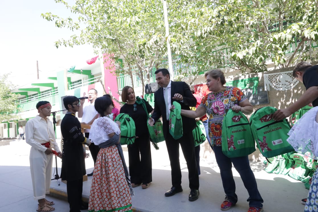 El evento se llevó a cabo en las instalaciones ubicadas al sur de la ciudad, donde además, como parte de la Cruzada por la Educación, entregó simbólicamente mochilas a los alumnos.