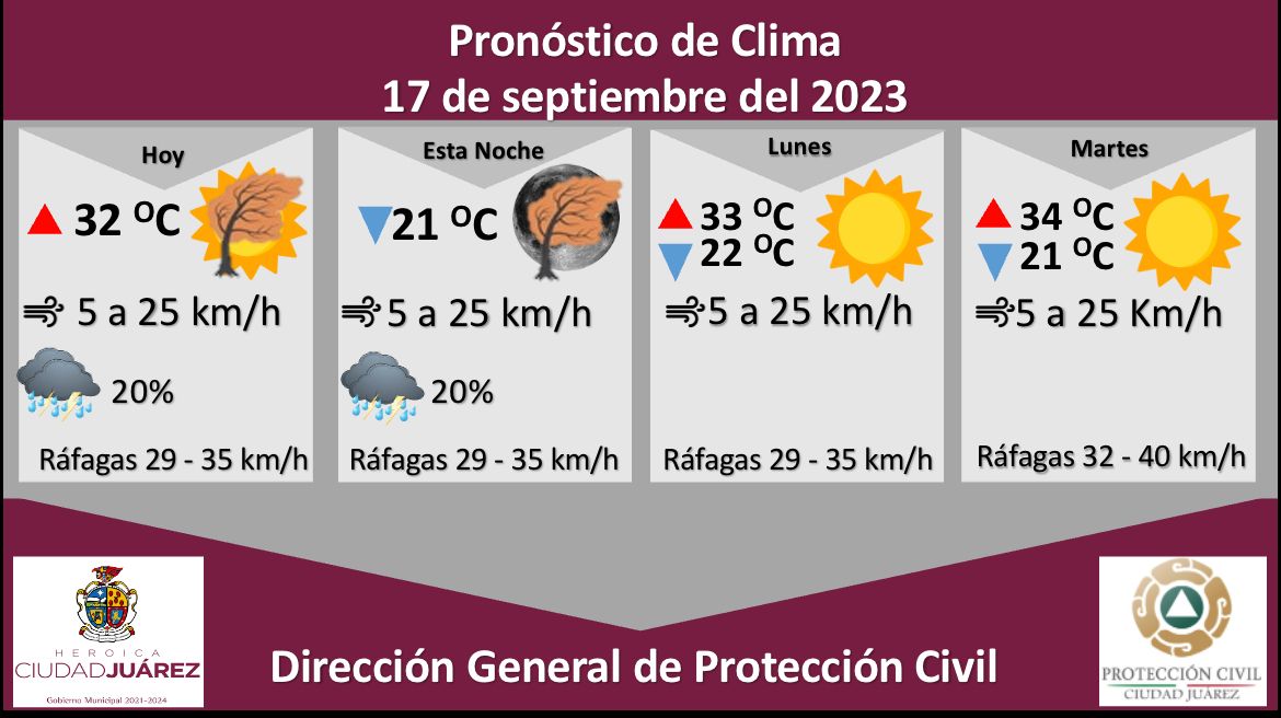Para hoy se esperan fuertes ráfagas de viento de hasta 35 kilómetros por hora, con una temperatura máxima de 32 °C y mínima de 21 °C, la velocidad del viento se pronostica entre 5 y 25 kilómetros por hora.