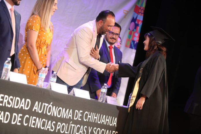 Esta tarde el secretario del Ayuntamiento Héctor Rafael Ortiz Orpinel, en representación del Presidente Municipal Cruz Pérez Cuéllar, acudió a la ceremonia de graduación de la Facultad de Ciencias Políticas y Sociales de la Universitaria Autónoma de Chihuahua.