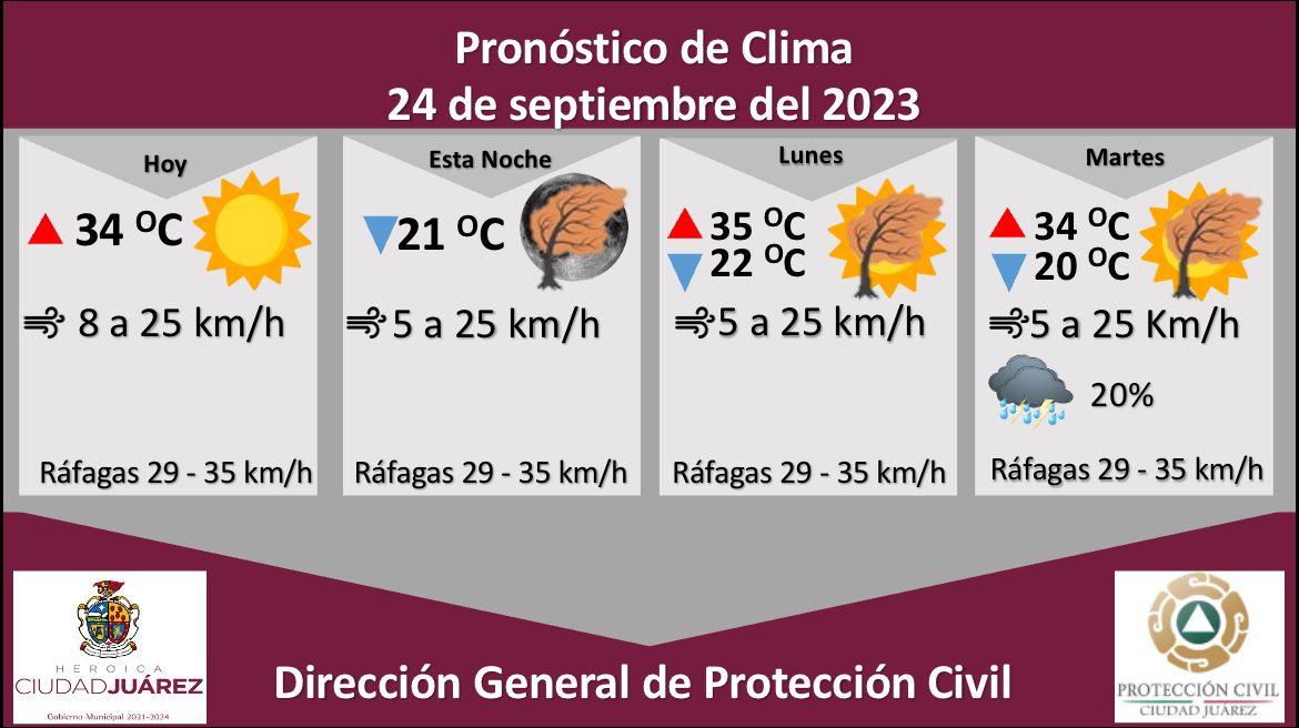 El martes las ráfagas de viento serán de hasta los 35 kilómetros por hora, existe una probabilidad de lluvia de un 20 por ciento, se pronostica una temperatura máxima de 34 °C y mínima de 20 °C, la velocidad del viento oscilará entre 5 y 25 kilómetros por hora.