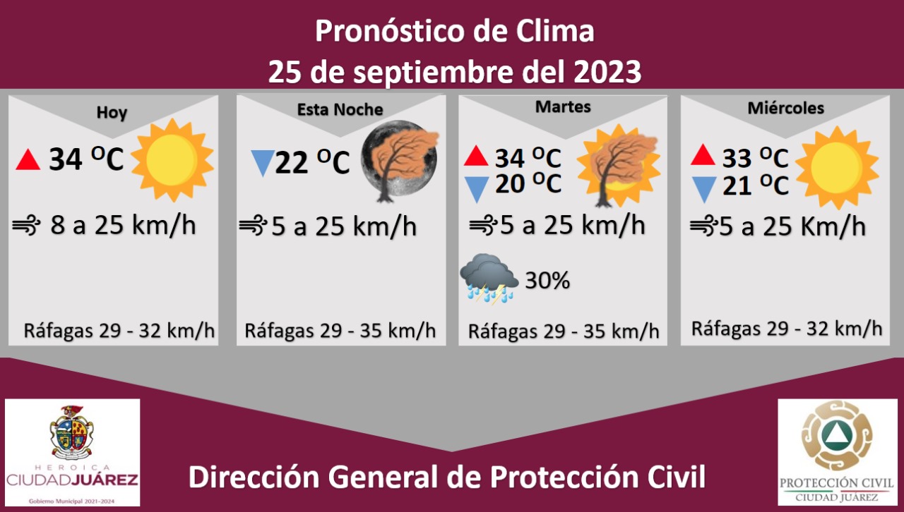 Para mañana martes se esperan ráfagas de viento que alcanzarán los 35 kilómetros por hora, hay una probabilidad de lluvia de un 35 por ciento, la temperatura máxima será de 34 °C y una mínima de 20 °C, el viento se mantendrá de 5 a 25 kilómetros por hora durante el transcurso del día.