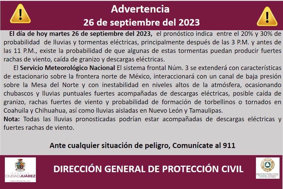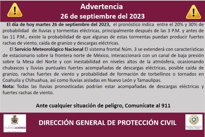 La Dirección General de Protección Civil emitió una alerta para la tarde de este martes, debido a la probabilidad de lluvia y tormentas eléctricas, principalmente después de las 3:00 de la tarde y hasta antes de las 11:00 de la noche, informó Roberto Briones Mota, titular de la dependencia.