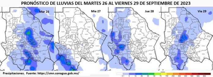 Las temperaturas máximas esperadas para la tarde de este 26 de septiembre son (°C): Chihuahua 32, Juárez 32, Janos 33, Madera 28, Temósachic 30, Cuauhtémoc 27, Ojinaga 36, Delicias 34, Camargo 33, Jiménez 31, Parral 30, Creel 26, Chínipas 40, Guachochi 25 y El Vergel 24ºC.