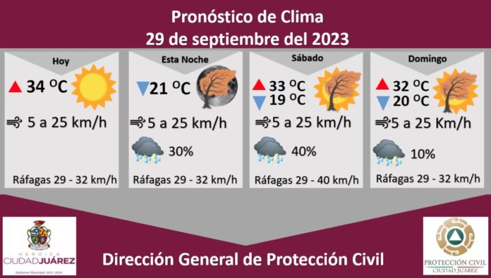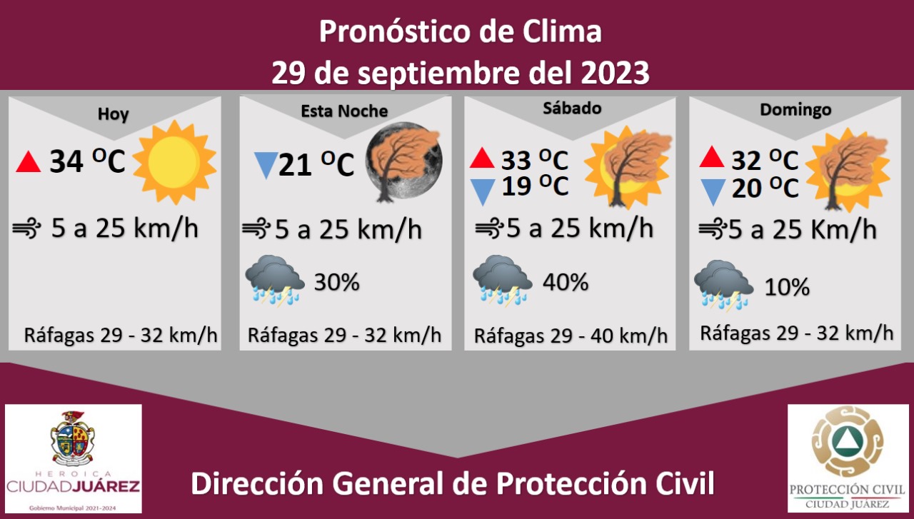 Para mañana sábado se esperan ráfagas de viento que alcanzarán los 40 kilómetros por hora, existe una probabilidad de lluvia de un 40 por ciento, la temperatura máxima será de 33 °C, mientras que la mínima se pronostica en 19 °C, la velocidad del viento será de 5 a 25 kilómetros por hora.