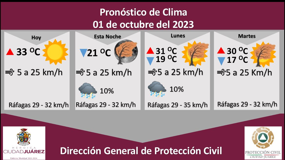 Para mañana lunes se esperan ráfagas de viento que alcanzarán los 35 kilómetros por hora, existe una probabilidad de lluvia de un 10 por ciento, la temperatura máxima será de 31 °C, mientras que la mínima se pronostica en 19 °C, la velocidad del viento será de 5 a 25 kilómetros por hora.
