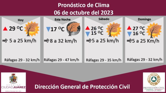 La Dirección General de Protección Civil, con base en informes del Servicio Meteorológico Nacional, pronostica fuertes ráfagas de viento que alcanzaran los 47 kilómetros por hora, la temperatura máxima para este viernes será de 29 grados Celsius, mientras que la mínima será de 17 °C para esta noche.