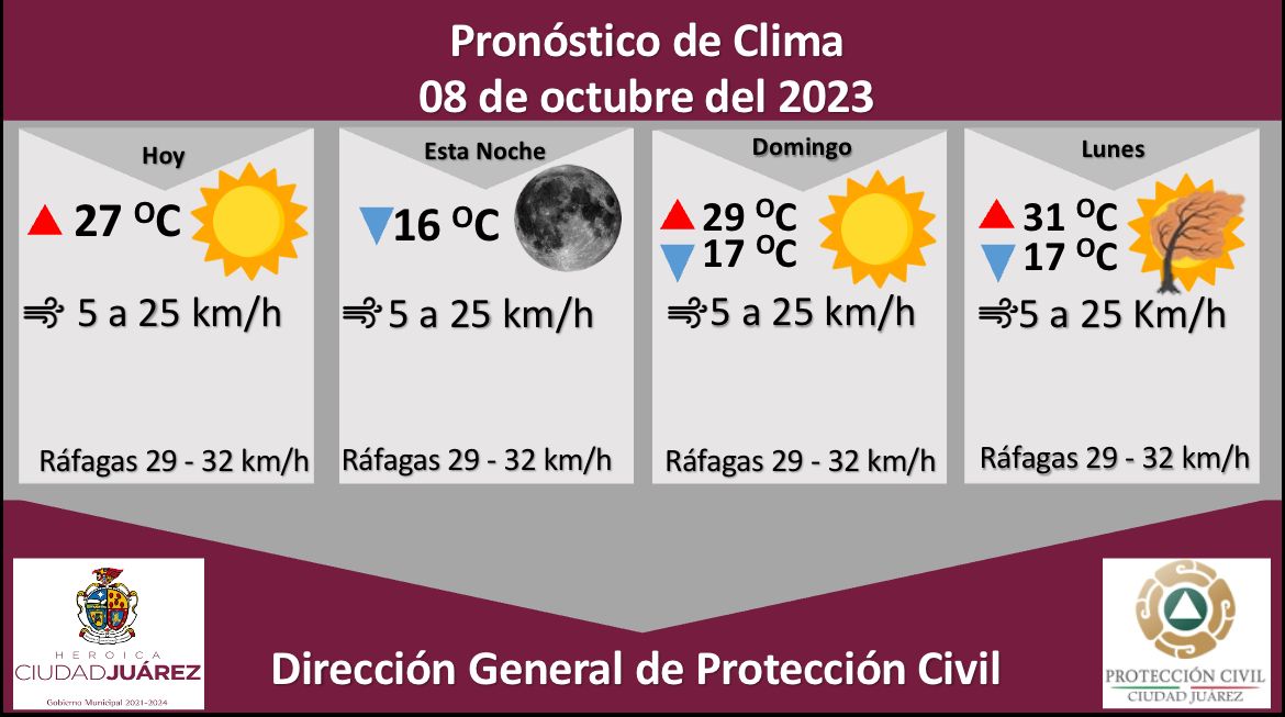 Roberto Briones Mota, titular de la dependencia, informó que para hoy se esperan fuertes ráfagas de viento que alcanzarán los 32 kilómetros por hora, en tanto que la velocidad del viento durante el día oscilará entre 5 y 25 kilómetros por hora.