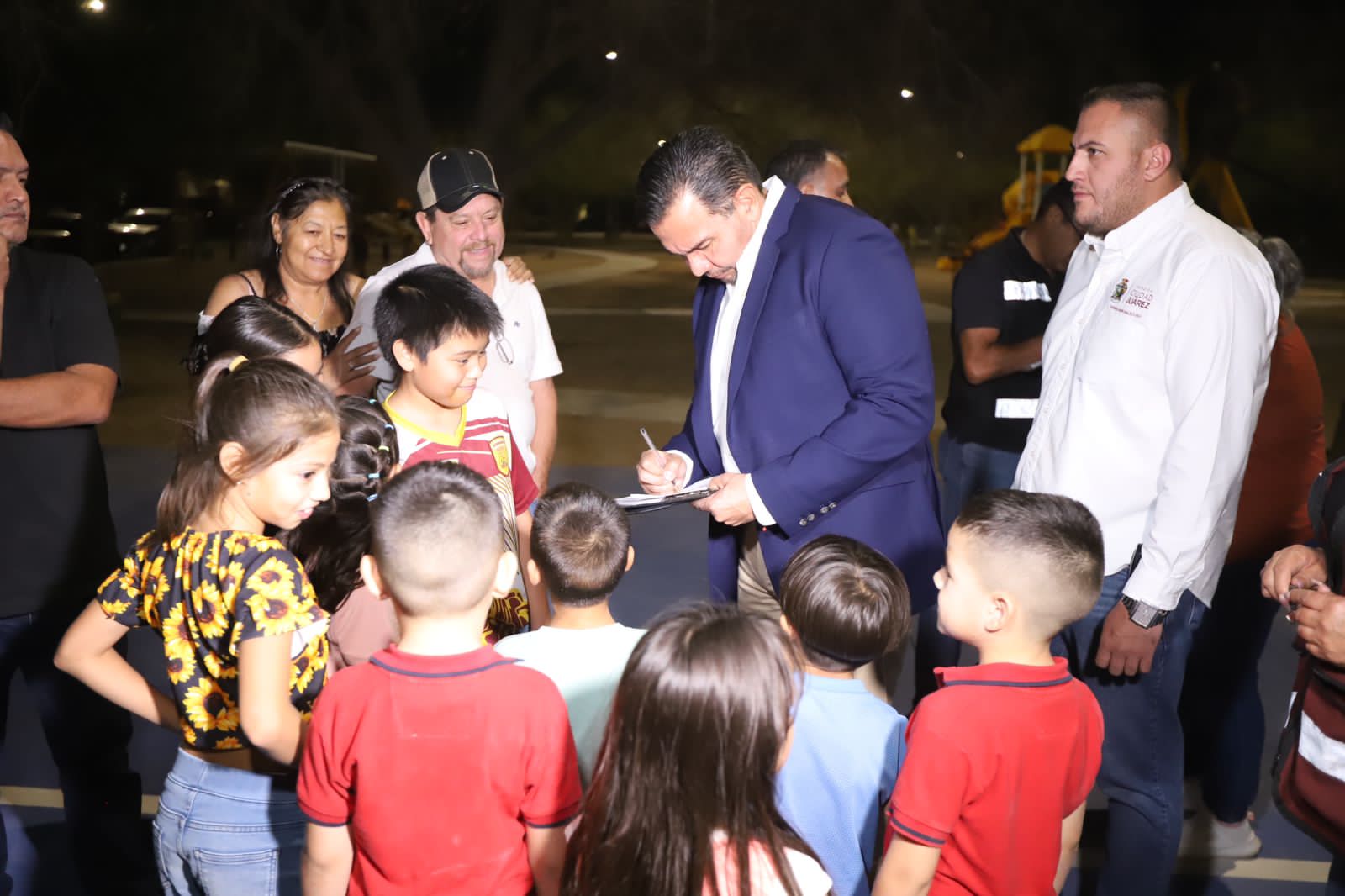 Habitantes de la colonia Salvarcar agradecieron al Presidente Municipal, Cruz Pérez Cuéllar, por la entrega del Parque Del Encanto, ubicado en la calle Encanto y calle Año 1993, el cual fue totalmente renovado como parte de las obras del Presupuesto Participativo.