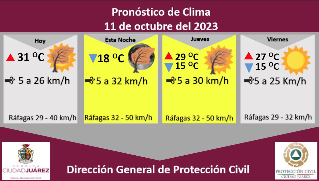 La Dirección General de Protección Civil, con base en informes del Servicio Meteorológico Nacional, emite una alerta amarilla para la tarde de este miércoles debido a fuertes ráfagas de viento, las cuales podrían llegar a los 50 kilómetros por hora, informó Roberto Briones Mota, titular de la dependencia.
