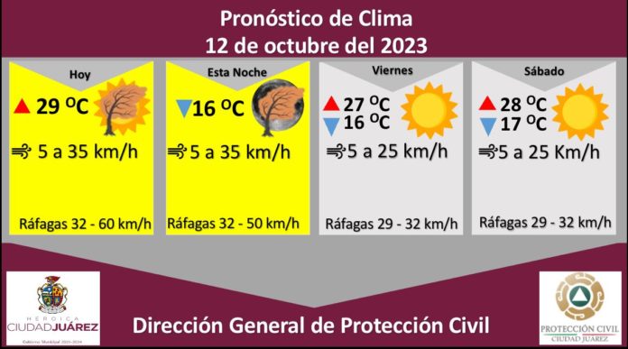 Para hoy se espera un día soleado con una temperatura máxima de 29 °C, mientras que la mínima se pronostica en 16 °C, la velocidad del viento será de 5 a 35 kilómetros por hora.