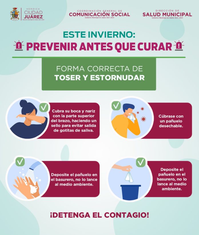 Además, al toser o estornudar es recomendable que el ciudadano cubra su boca y nariz con un pañuelo desechable, o con el codo interno del brazo para cubrir la boca y la nariz, pues esta medida ayuda a evitar la dispersión de microbios en el aire.