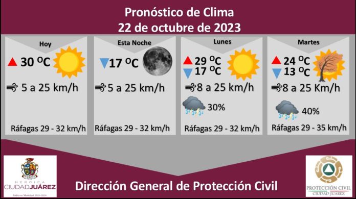 Para mañana lunes se esperan fuertes ráfagas de viento que llegarán los 32 kilómetros por hora, además existe una probabilidad de lluvia de un 30 por ciento, la temperatura máxima se pronostica en los 29 °C, mientras que la mínima será de 17 °C, la velocidad del viento oscilará de 8 a 25 kilómetros por hora.