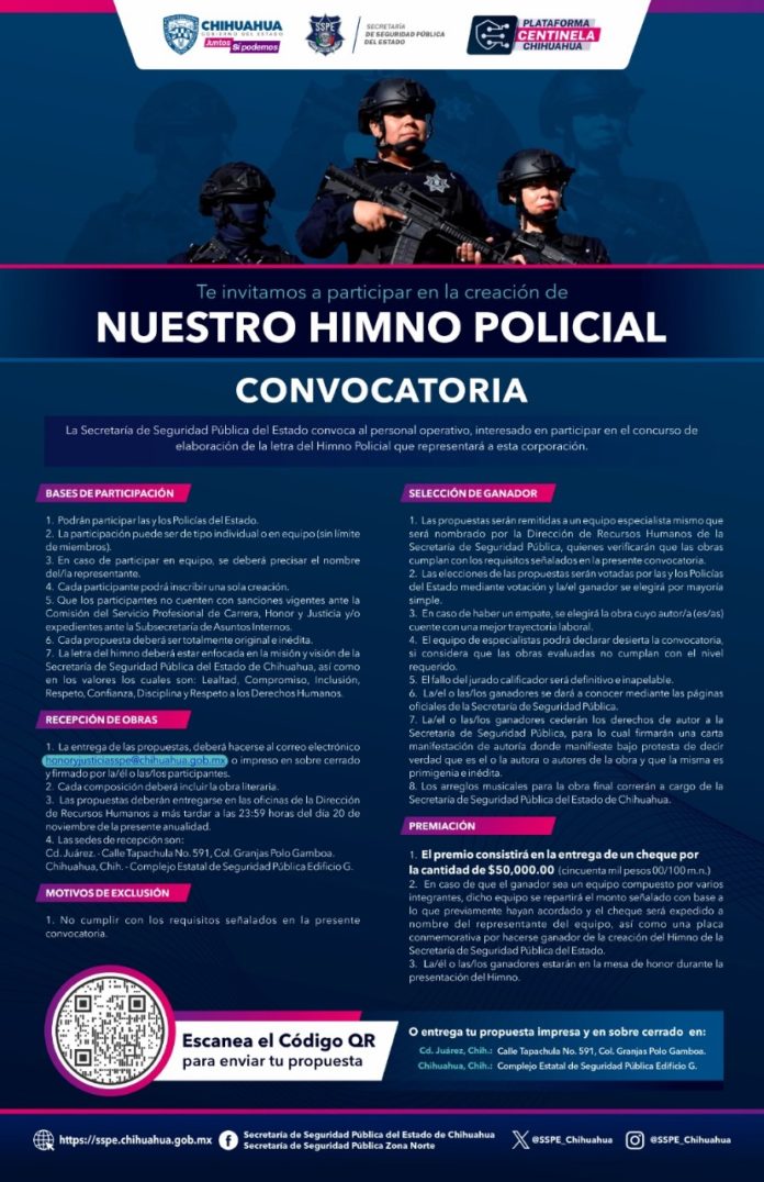 Con el objetivo de fomentar la pertenencia y el civismo de los agentes de la Secretaría de Seguridad Pública del Estado (SSPE), la Comisión del Servicio Profesional de Carrera, Honor y Justicia lanzó la convocatoria para la “Creación del Himno Policial 2023”.