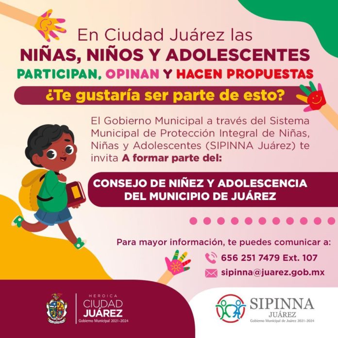 El Sistema Municipal de Protección Integral de Niñas, Niños y Adolescentes (SIPINNA), convoca a todos los infantes a participar en el Consejo de la Niñez y Adolecencia del Municipio de Juárez, con el propósito de que puedan opinar y hacer sus propuestas sobre la ciudad.