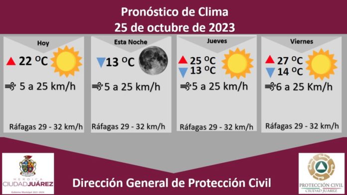 Roberto Briones Mota, titular de la dependencia, informó que para hoy se esperan ráfagas de viento que alcanzarán los 32 kilómetros por hora, en tanto que la velocidad del viento durante el día oscilará entre 5 y 25 kilómetros por hora.