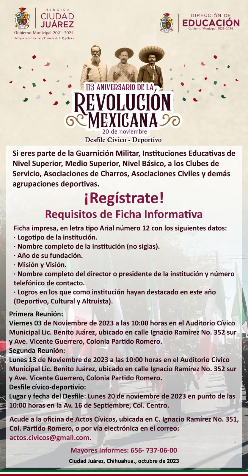 La Dirección de Educación Municipal invita a participar en el Desfile Cívico-Deportivo en Conmemoración por el 113 Aniversario de la Revolución Mexicana, evento que se llevará a cabo el próximo 20 de noviembre.