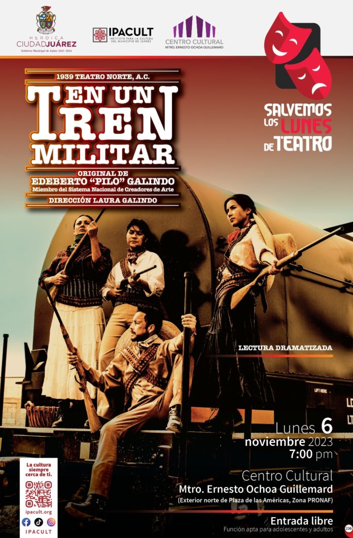 Para seguir con las actividades culturales, el Instituto para la Cultura del Municipio de Juárez (IPACULT), continúa con el programa “Salvemos los lunes de teatro” y presenta la obra “En un tren militar”, del dramaturgo Edeberto “Pilo” Galindo, el próximo lunes 06 de noviembre a las 7:00 de la tarde.