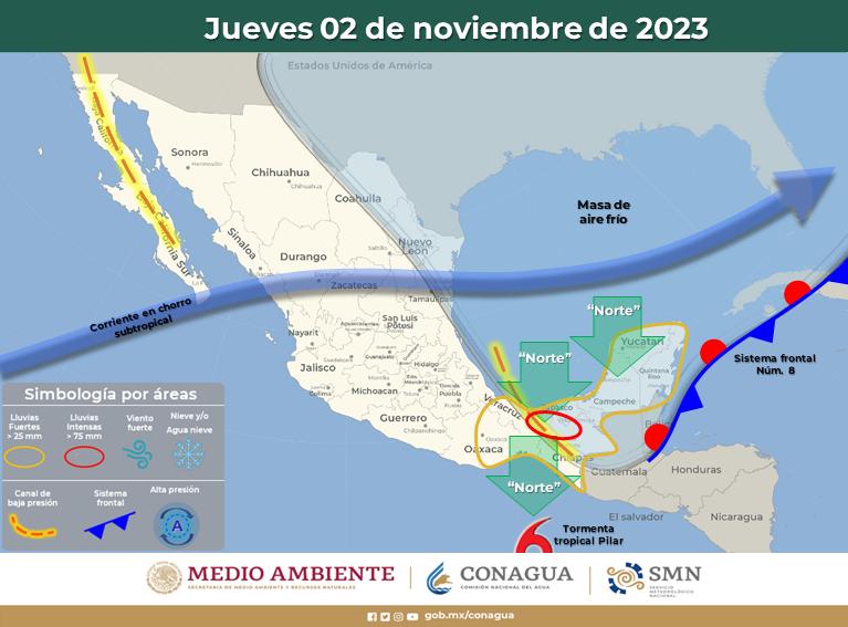 La dependencia informó que de acuerdo al Servicio Meteorológico Nacional (SMN), para este jueves 2 de noviembre, el frente frio número 8 provocará un ambiente con temperaturas de templadas a cálidas por la tarde.