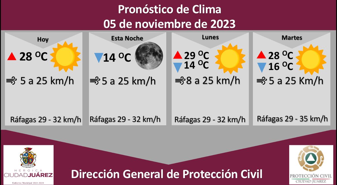 Para mañana lunes se esperan fuertes ráfagas de viento que llegarán los 32 kilómetros por hora, la temperatura máxima se pronostica en los 29 °C, mientras que la mínima será de 14 °C, la velocidad del viento oscilará de 8 a 25 kilómetros por hora.
