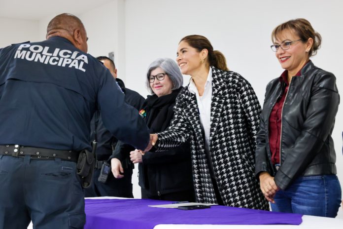 Rubí Enríquez, presidenta del Sistema de Desarrollo Integral de la Familia del Municipio de Juárez (DIF), entregó constancias a agentes de la Secretaria de Seguridad Pública (SSPM).