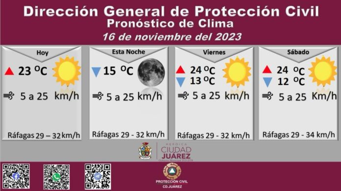 Roberto Briones Mota, titular de la dependencia, informó que para hoy se esperan fuertes ráfagas de viento que alcanzarán los 32 kilómetros por hora, en tanto que la velocidad del viento durante el día oscilará entre 5 y 25 kilómetros por hora.