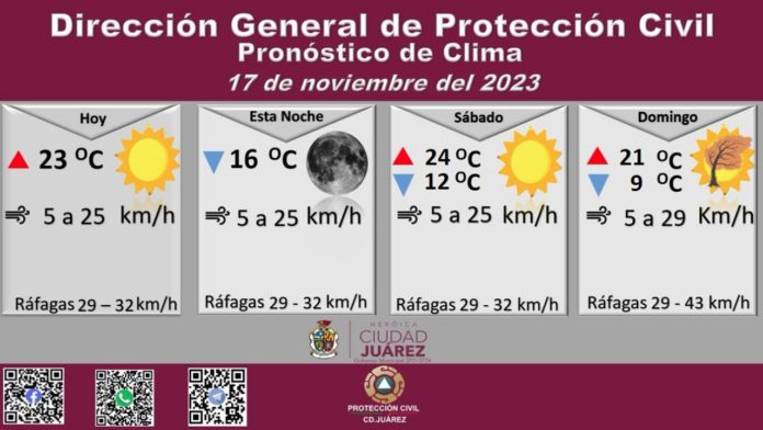 Roberto Briones Mota, titular de la dependencia, informó que para hoy se esperan ráfagas de viento que alcanzarán los 32 kilómetros por hora, en tanto que la velocidad del viento durante el día oscilará entre 5 y 25 kilómetros por hora.
