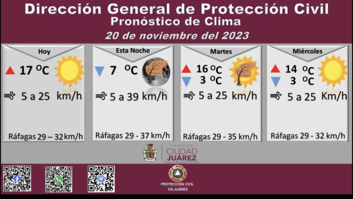 Roberto Briones Mota, titular de la dependencia, informó que para hoy se esperan fuertes ráfagas de viento que alcanzarán los 37 kilómetros por hora, en tanto que la velocidad del viento durante el día oscilará entre 5 y 39 kilómetros por hora.