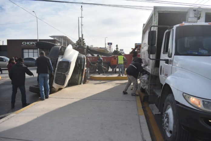 Tras la volcadura que se registró este lunes por la mañana en el cruce de las avenidas Adolfo López Mateos e Insurgentes, en donde se involucra una unidad de la Dirección de Limpia, se informó que no hubo heridos, ni daños a terceros.